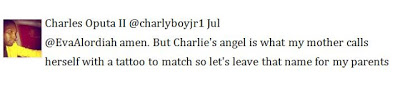 Rapper Eva & boo, Charles Oputa Jnr express love on twitter Posted by: b3rrilyn in Celebrity News, GIST Jul 8, 2013 See how Eva‘s boo, Charly boy’s son cares for her. Read their tweets below Charles Oputa Jnr eva Love Twitter 2013-07-08 b3rrilyn