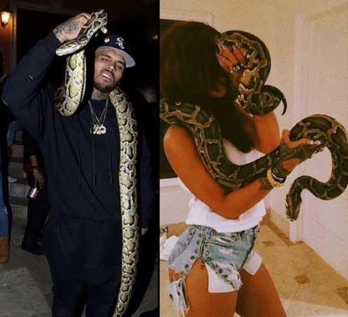 Who would have thought that ex-lovers Rihanna and Chris Brown will ever party at the same place at the same time, well, this is what happened and they even both cuddled the same snake at the party.