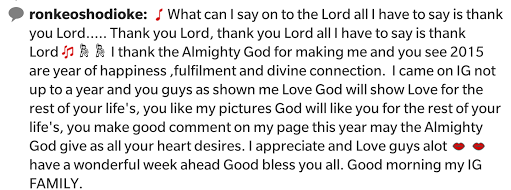 Ronke Oshodi Oke thanks her fans for liking her pics on instagram Posted by: b3rrilyn in Celebrity News Jan 12, 2015 Na wa! All these prayer on top liking photos? Ronke Oshodi Oke 2015-01-12 b3rrilyn