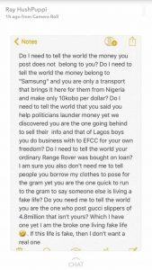 Hushpuppi is not letting Mompha drag his name to the mud alone, he decided they can both have a filled day playing with dirts. He revealed that Mompha, who is a Dubai-based businessman, helps politicans launder stolen money from Nigeria and allegedly leaks the secrets of Lagos big boys he does business with to the Economic and Financial Crimes Comission (EFCC).