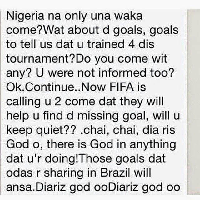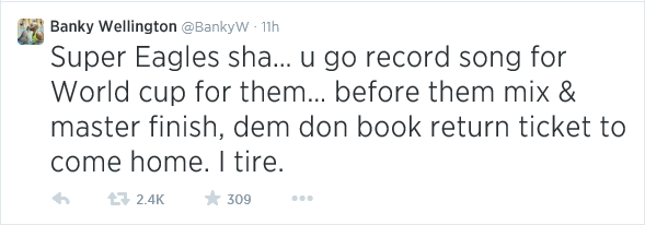 See Banky W and Nigerians hilarious reaction to Nigeria vs Iran match Posted by: b3rrilyn in GIST, NaijaVibe.Net, Sports Jun 17, 2014 Nigeria played Iran yesterday and the game ended in a goalless draw to the disappointment of many Nigerians. Many are of the opinion that if we cant beat Iran then who can we beat.. See hilarious reactions below: Banky W Super Eagles World Cup 2014-06-17 b3rrilyn