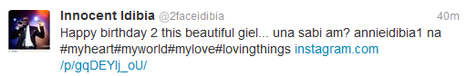 See Tuface’s sweet birthday message to Annie Posted by: b3rrilyn in Celebrity News Nov 14, 2013 So sweet!! Annie Idibia Tuface 2013-11-14 b3rrilyn