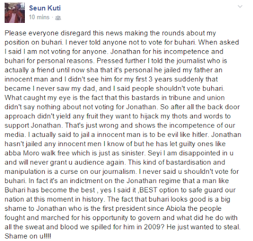 Seun Kuti denies saying people shouldn’t vote for Buhari