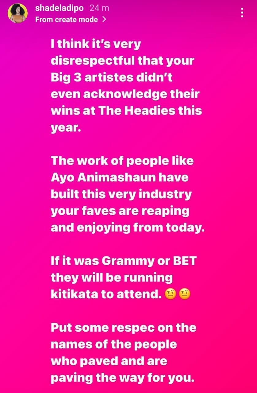 According to her, she is very ashamed of their actions because if these artists won the BET or Grammy, they would be running helter-skelter to attend and flaunt their wins.