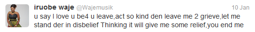 Singer Waje tweets about heartbreak Posted by: b3rrilyn in Celebrity News Jan 12, 2014 Singer Waje is currently going through heartbreak. She and her boyfriend of almost a year broke up recently. Waje took to twitter to express her sadness over the end of the relationship. Waje 2014-01-12 b3rrilyn