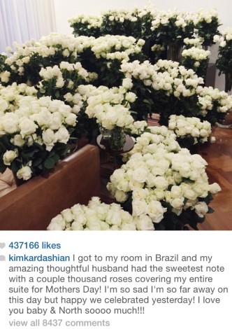 So Sweet! See the mother’s day gift Kanye gave to Kim Posted by: b3rrilyn in Celebrity News May 11, 2015 Yesterday was mother’s day and even though Kim was far away in Brazil, Kanye still surprised the mother of his daughter. They say distance is not a barrier to show love and Kanye has proved it by sending Kim thousands of white roses. Kanye West Kim Kardashian 2015-05-11 b3rrilyn