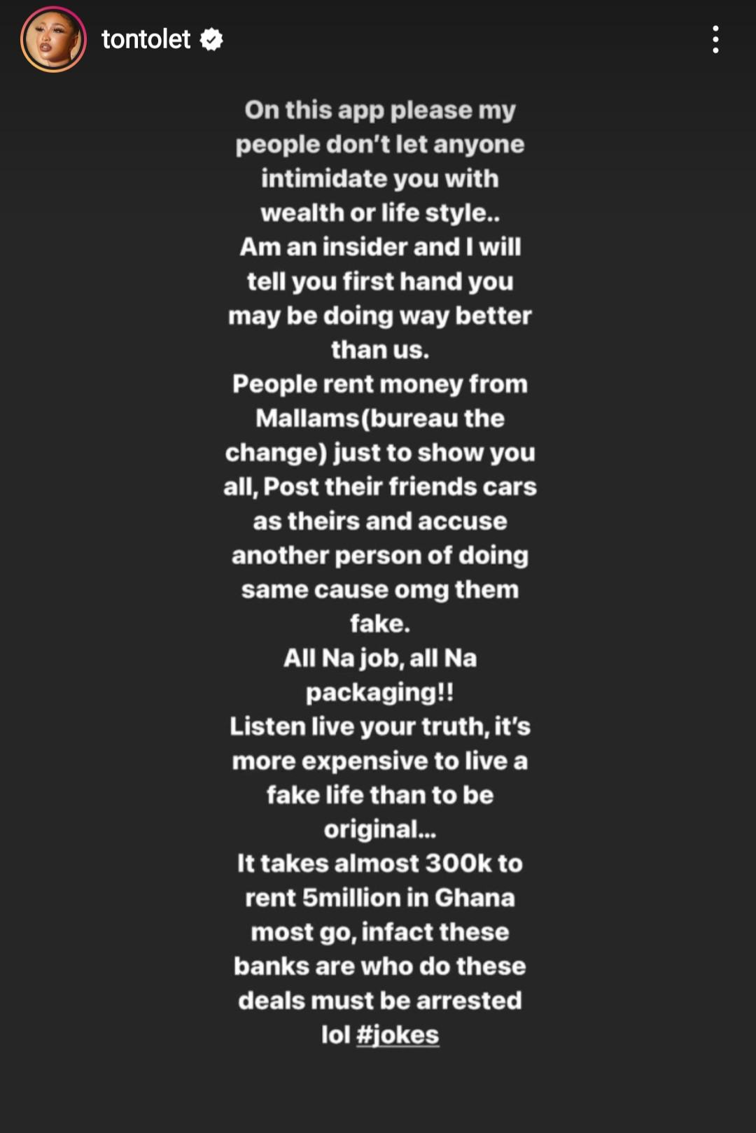 According to her, people live fake lives for the gram and some even go as far as renting money from Mallams just for flaunting purposes.