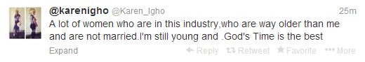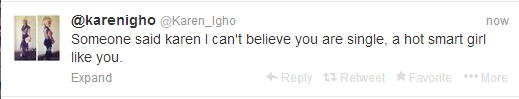 Karen tweets a lot about her single status, well I think she will find the right person soon but she needs to stop talking about it always so as not to sound too desperate