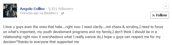BBA Angelo Collins just took to his Twitter and FB pages to say he does not think he should be in a relationship right now, days after his former girlfriend SA model Candice Arends flaunted their reunion on twitter.