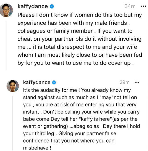 Kaffy added that such an act from people she calls friends is totally disrespectful to their wives and herself.