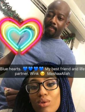 The mother of one took to her Snapchat app to share a loving photo with her husband and she definitely had the sweetest words for him. She captioned the adorable photo with: Blue hearts. My best friend and life partner. Wink.. MashaaAllah