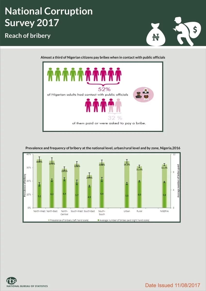 The National Corruption Survey 2017 which was carried out by Dr. Yemi Kale The Statistician General of the Federation / CEO Nigerian National Bureau of Statistics, the survey which with the use of graphics explained one of the greatest challenges we have as a country. It shows the various ...
