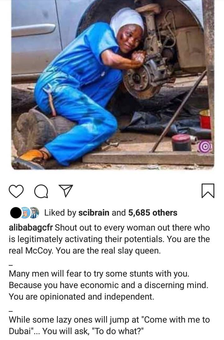 Alongside a picture of a female mechanic, Ali Baba said hardworking women are the ones that strive to be as independent as possible, while the slay queens are lazy.
