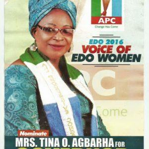 Deputy Woman Leader APC in Edo State and Former governorship aspirant of the party, Mrs Tina Agbarha, has announced her defection to the People’s Democratic Party.