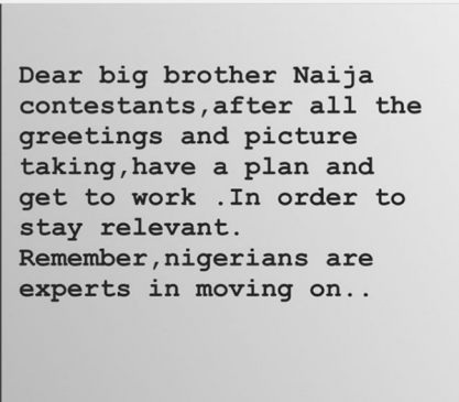 Dear Big Brother Naija contestant, after all the greetings and the picture taking, have a plan and get to work. In order to stay relevant. Remember Nigerians are experts in moving on.