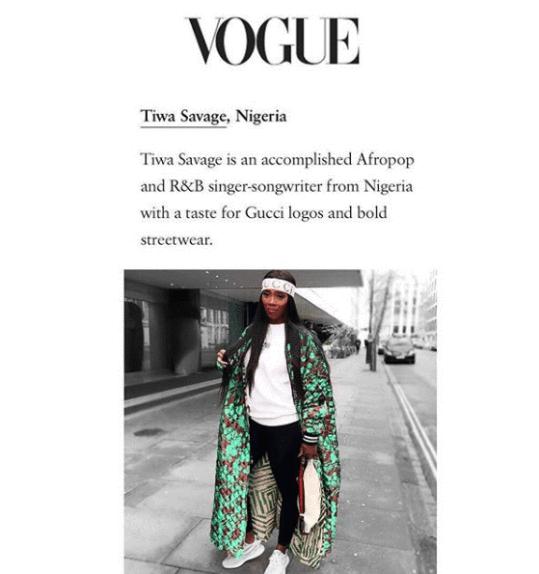 Home » Celebrity News » Tiwa Savage featured in Vogue Magazine’s 10 world most stylish celebrities on IG