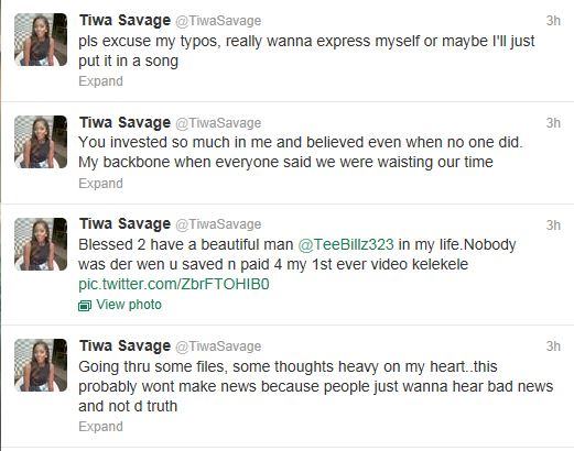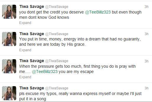Tiwa Savage Posts Sweet, Loving Tweets About Her Fiance Teebillz Posted by: b3rrilyn in Celebrity News Apr 19, 2013 Someone is truly in love.. Happy for her We would love to know your thoughts on this post. Drop your comments TeeBillz Tiwa Savage 2013-04-19 b3rrilyn