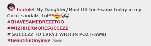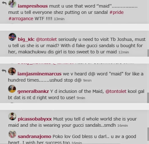 Tonto Dikeh just shared this photo of hermaid/cook Onyinye off for exams today rocking her Gucci sandals. Nigerians didnt take it well as they blasted her for using the word maid and not something less degrading