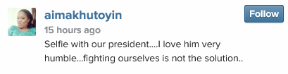 Toyin Aiymakhu takes a selfie with President Jonathan Posted by: b3rrilyn in Celebrity News Feb 4, 2015 She captioned the pic: “Selfie with our president…. I love him very humble.. #mychoice” Goodluck Jonathan Toyin Aimakhu 2015-02-04 b3rrilyn