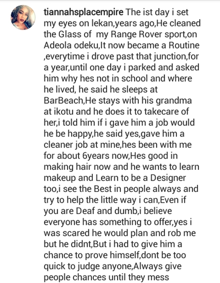 “The 1st day I set my eyes on Lekan years ago, he cleaned the glass of my Range Rover Sport on Adeola odeku”, the mum of two said, and told in details, how Lekan slept at the Bar Beach at nights and worked as a cleaner by morning just to be able to raise funds and care for this grandmother.