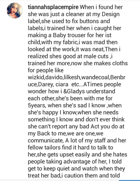 For Gladys, she started with working as a cleaner, to ‘fixing buttons’ at Lawani’s workplace. But it all changed when Gladys dared to make baby’s pants, and the impressed designer encouraged the impaired woman to improve on her skills. Now she makes cloths for people like Wizkid, Davido, Lil Kesh, Wandecoal, Benbruce, Darey, Ciara, etc.