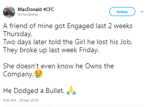 According to a Twitter user, a lady broke up her engagement after her fiance “lost” his job. The lady had no idea he was the owner of the company.