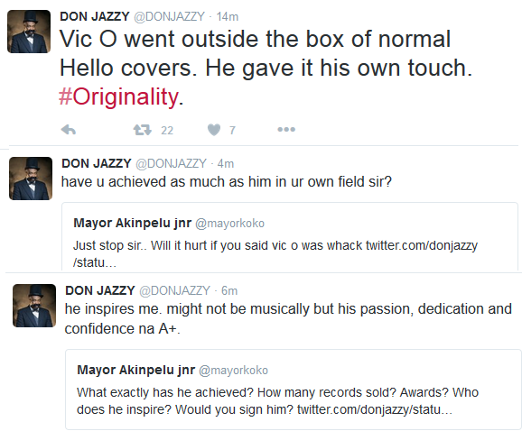 Don Jazzy has heaped praises on rapper Vic O for his dedication and passion after he dropped his cover of Adele’s record breaking hit single Hello last night