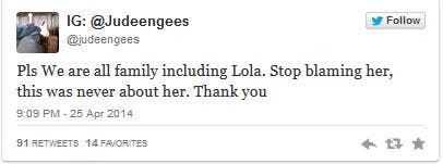 Jude Okoye took to his twitter page to plead with Psquare fans to stop pointing fingers at Lola and calling her names. As she was fingered as the cause of the split