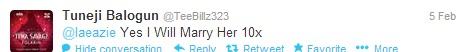 ‘Will you marry her if i told you Tiwa licked me’, fan to Tee billz Posted by: b3rrilyn in GIST Feb 7, 2013 Some people don’t know their limits sha.. Nice answer Tee Billz Tee bilzz Tiwa Savage 2013-02-07 b3rrilyn