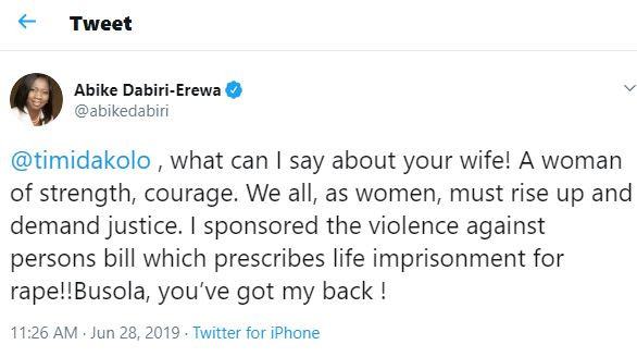 According to the ex-member of the Nigeria Federal House of Representatives, “we all, as women, must rise up and demand justice. I sponsored the violence against persons bill which prescribes life imprisonment for rape! Busola, you’ve got my back.”
