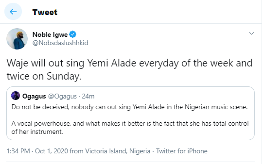 Reacting, Noble wrote, “Waje will out sing Yemi Alade every day of the week and twice on Sunday.”
