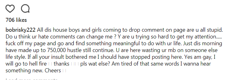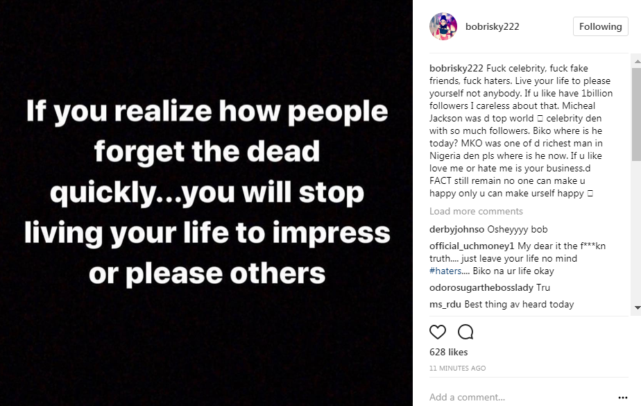 �Fuck celebrity, fuck fake friends, fuck haters. Live your life to please yourself not anybody. If u like have 1billion followers I careless about that. Micheal Jackson was d top world celebrity den with so much followers. Biko where is he today? MKO was one of d richest man in Nigeria den pls where is he now. If u like love me or hate me is your business.d FACT still remain no one can make u happy only u can make urself happy