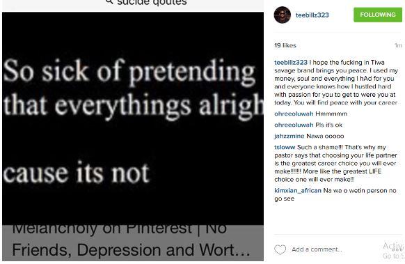 Teebillz, is considering committing suicide in the aftermath of a breakdown in his marriage with his superstar wife.