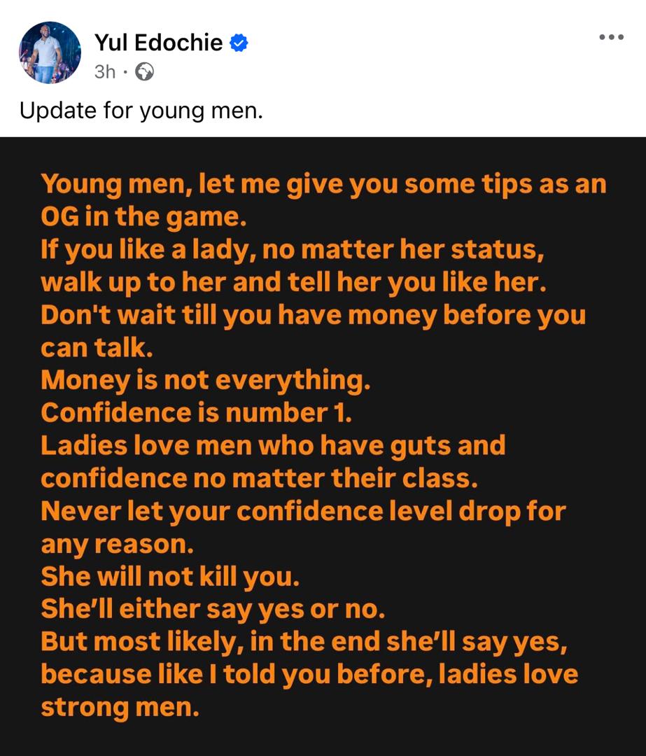 According to him, as an OG in the dating scene, he can confirm that if a man really likes a lady, no matter her status, he has to walk up to her and make his feelings known.